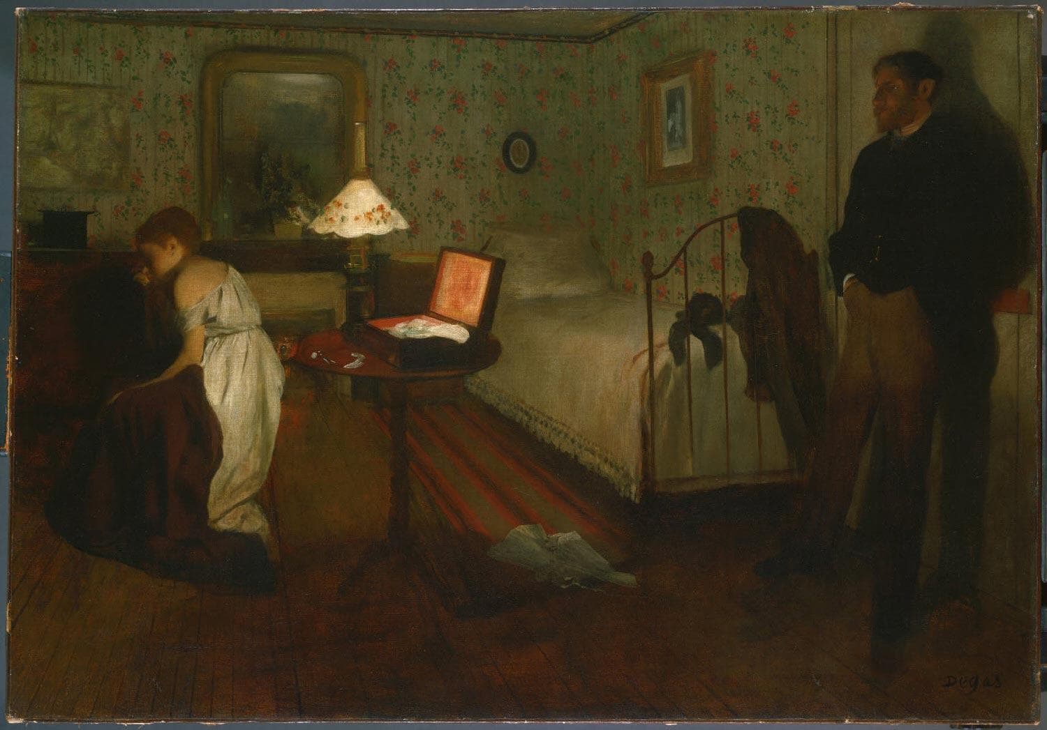 Described as the most puzzling of degas's major works, it depicts a tense confrontation by lamplight between a man and a partially undressed woman.